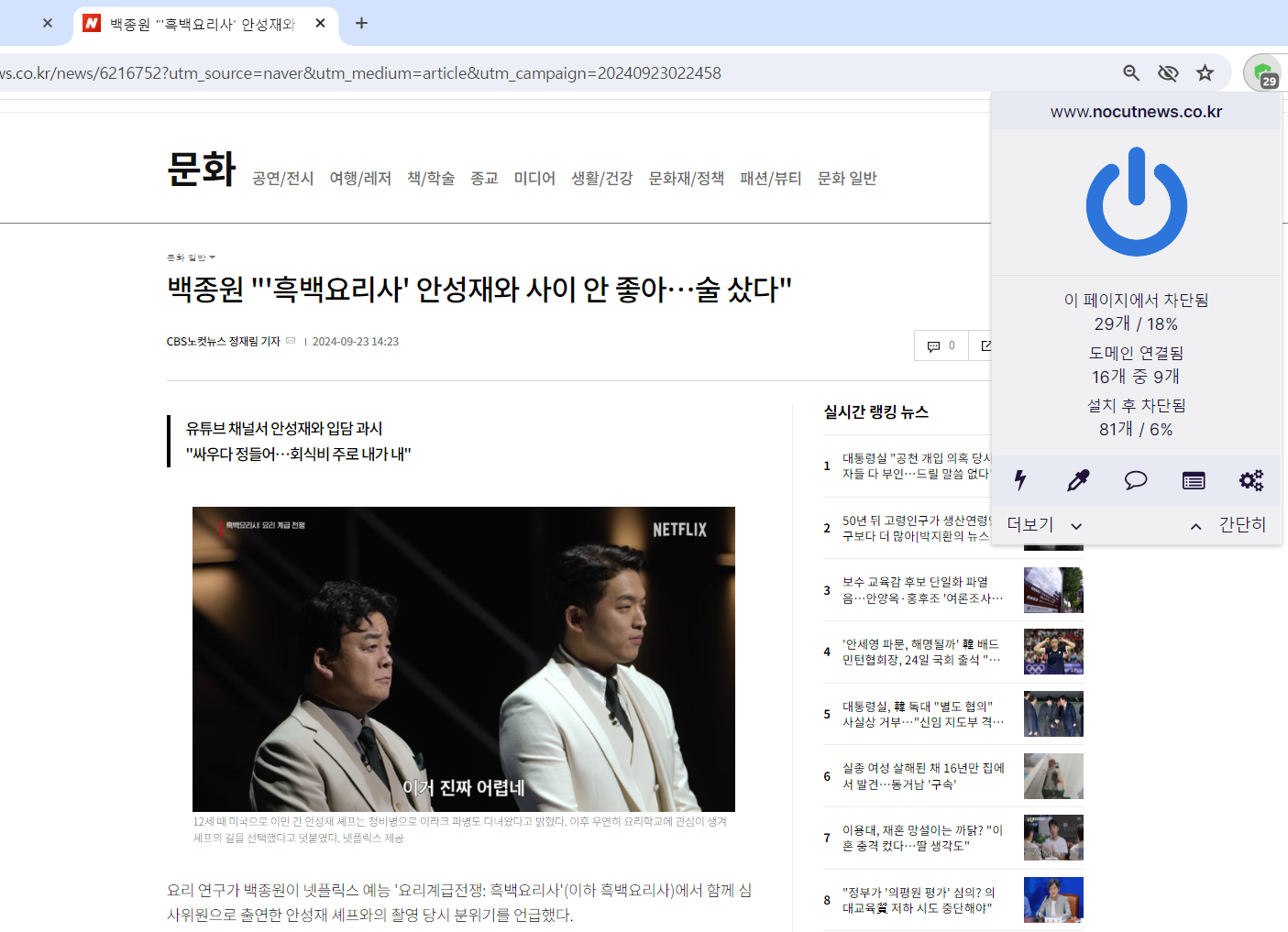 요즘 넷플릭스 흑백요리사의 인기가 전 세계적으로 대단하다고 합니다.다양한 재료에 흥미로운 소재로 기상천외한 요리들을 만들어지고 있는 모습을보다 보면 정주행을 할 수밖에 없지요 나폴리맛피아의 우승으로 종영이 되었지만 아직 여운이 가시질 않아 이따금 유튜브나 뉴스로흑백요리사 검색을 하다 보면 유튜브 동영상광고나 뉴스기사 속 배너광고로 인해 매번 광고들의홍수 속에 집중이 되질 않습니다. 그래서 광고 없이 흑백요리사 근황을 보다 쉽고 빠르게 볼 수 있는 방법을 소개하려고 합니다. 바로 오로라브라우저인데요 광고차단 브라우저인 오로라브라우저(www.ororabrowser.com)를 설치하면 모든 웹사이트에서광고노출이 안 나타납니다. 신기하게도 기사나 유튜브 등 광고가 전부 사라지고 보다 빠르고 쉽게 로딩이 가능합..
